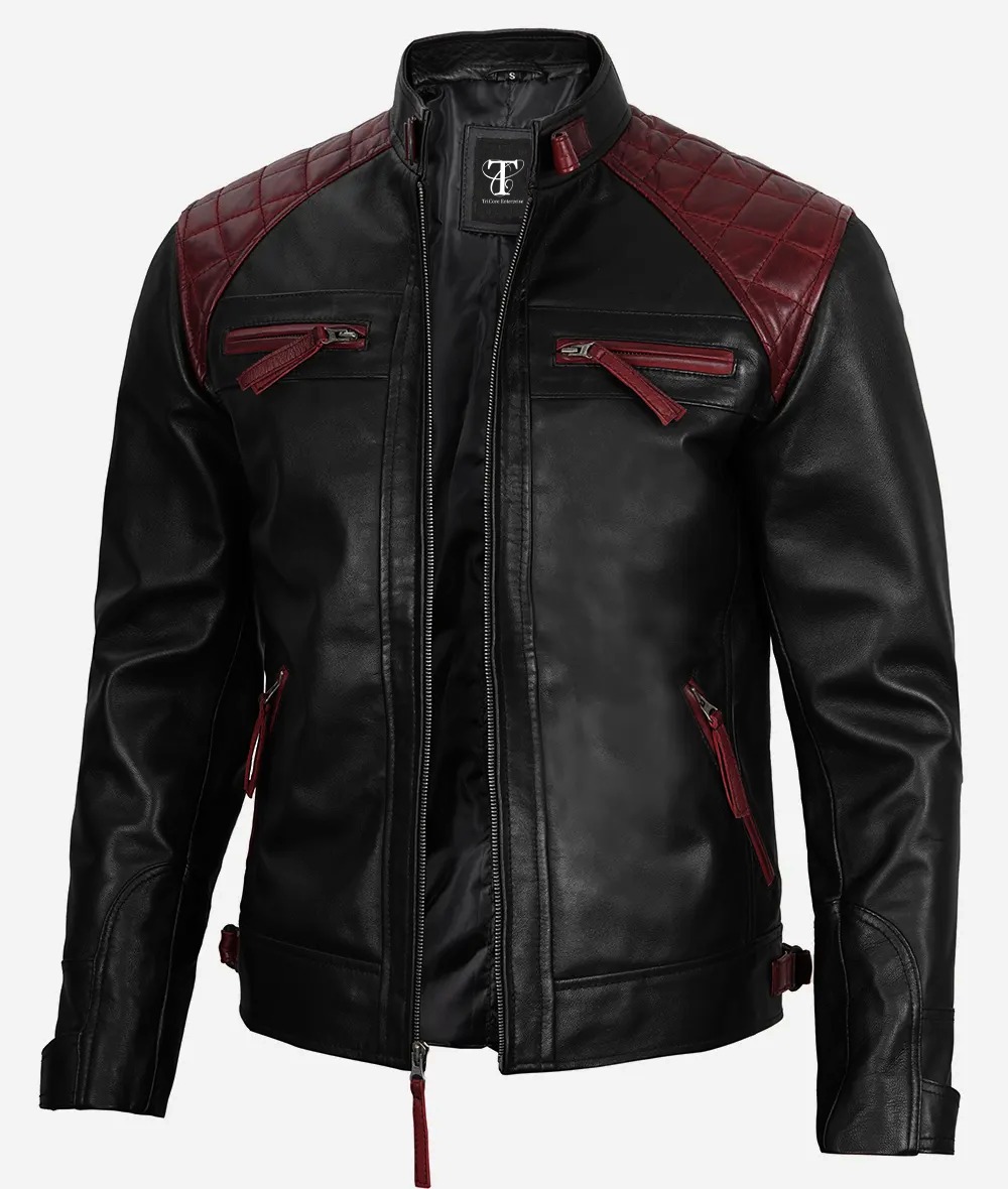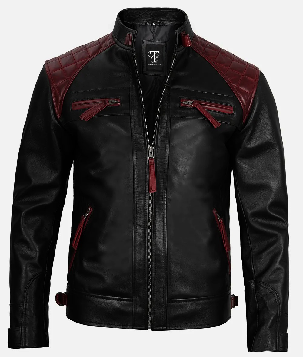 Men’s Black and Maroon Café Racer Leather Jacket – Quilted Shoulder | TriCore
