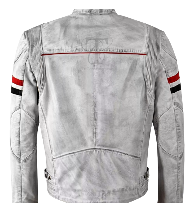 Mens Cafe Racer Vintage White Biker Leather Jacket with Red & Black Stripes – Real Leather Classic