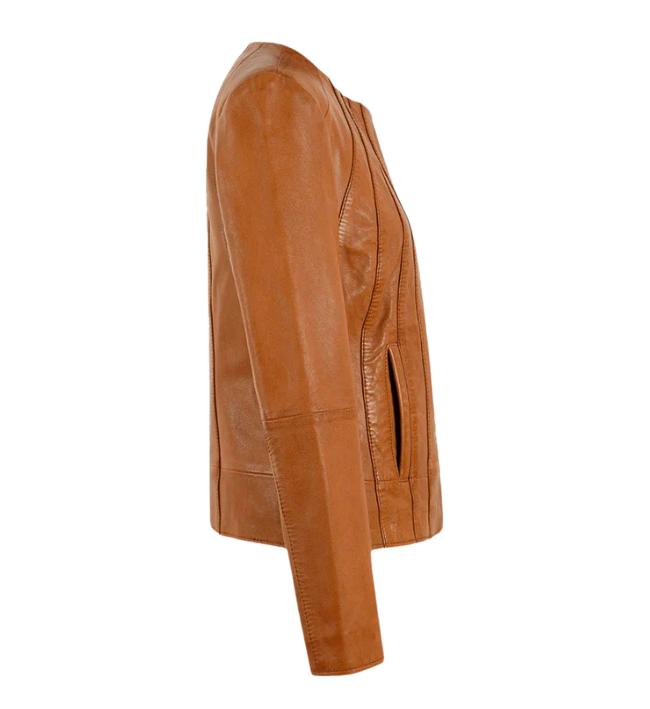 Women’s Collarless Cowhide Leather Jacket – Sleek Modern Outerwear