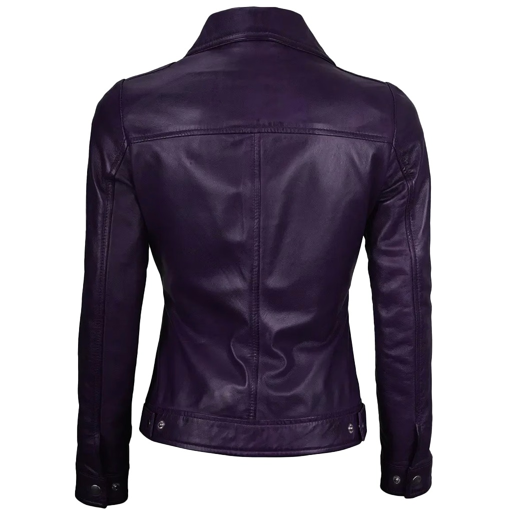 Elevate your everyday style with this Women’s Purple Leather Jacket, featuring a classic shirt-style collar and a sleek, tailored fit. Crafted from 100% genuine leather, this jacket combines timeless design with a bold color twist – perfect for women who love to stand out with sophistication.